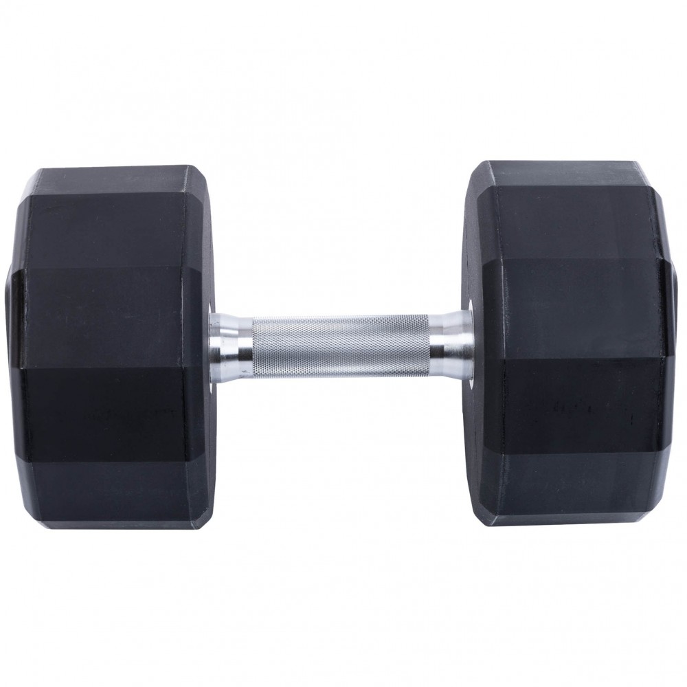 Диски гантелей имеют по 12 граней, углы которых скошены. Полиуретановое покрытие препятствует появлению коррозии, а также защищает напольное покрытие в случае падения гантелей. Ручка хромированная для защиты от коррозии. На ручке присутствуют насечки, которые в процессе использования изделия улучшают сцепление с руками. Вес гантелей указан на дисках.