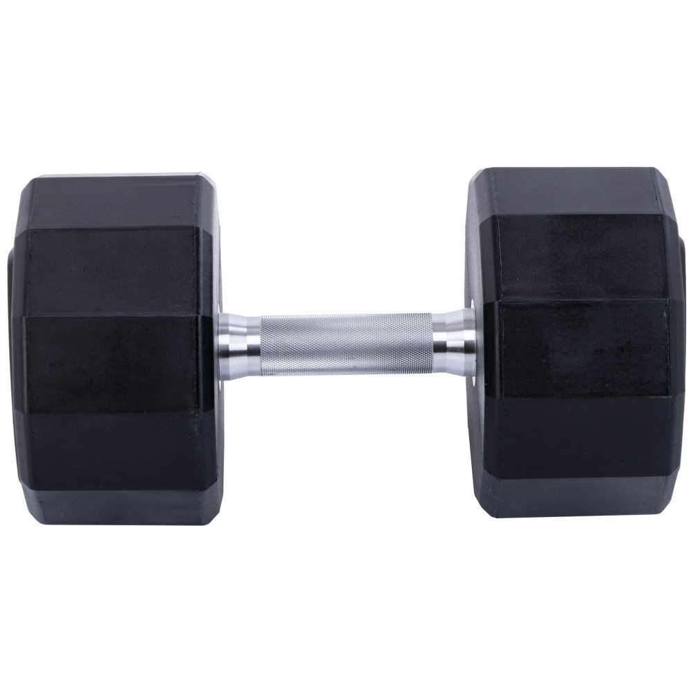 Диски гантелей имеют по 12 граней, углы которых скошены. Полиуретановое покрытие препятствует появлению коррозии, а также защищает напольное покрытие в случае падения гантелей. Ручка хромированная для защиты от коррозии. На ручке присутствуют насечки, которые в процессе использования изделия улучшают сцепление с руками. Вес гантелей указан на дисках.