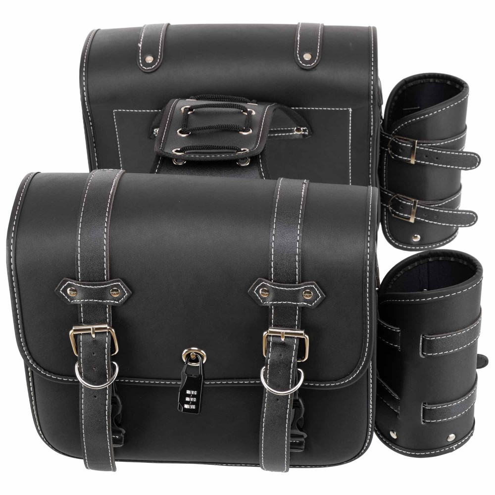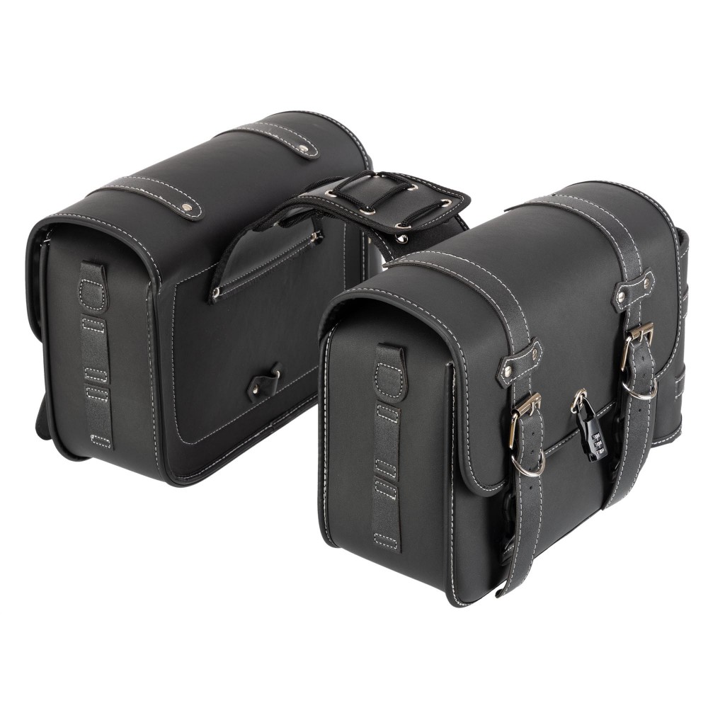 Комплект состоит из двух боковых сумок, выполненных из прочного полиуретана (PU), который отличается высокой устойчивостью к износу и воздействию внешней среды. Этот материал защищает содержимое от влаги, грязи и механических повреждений, гарантируя долговечность аксессуара. Жёсткая конструкция сумок помогает сохранять форму даже при интенсивной эксплуатации.