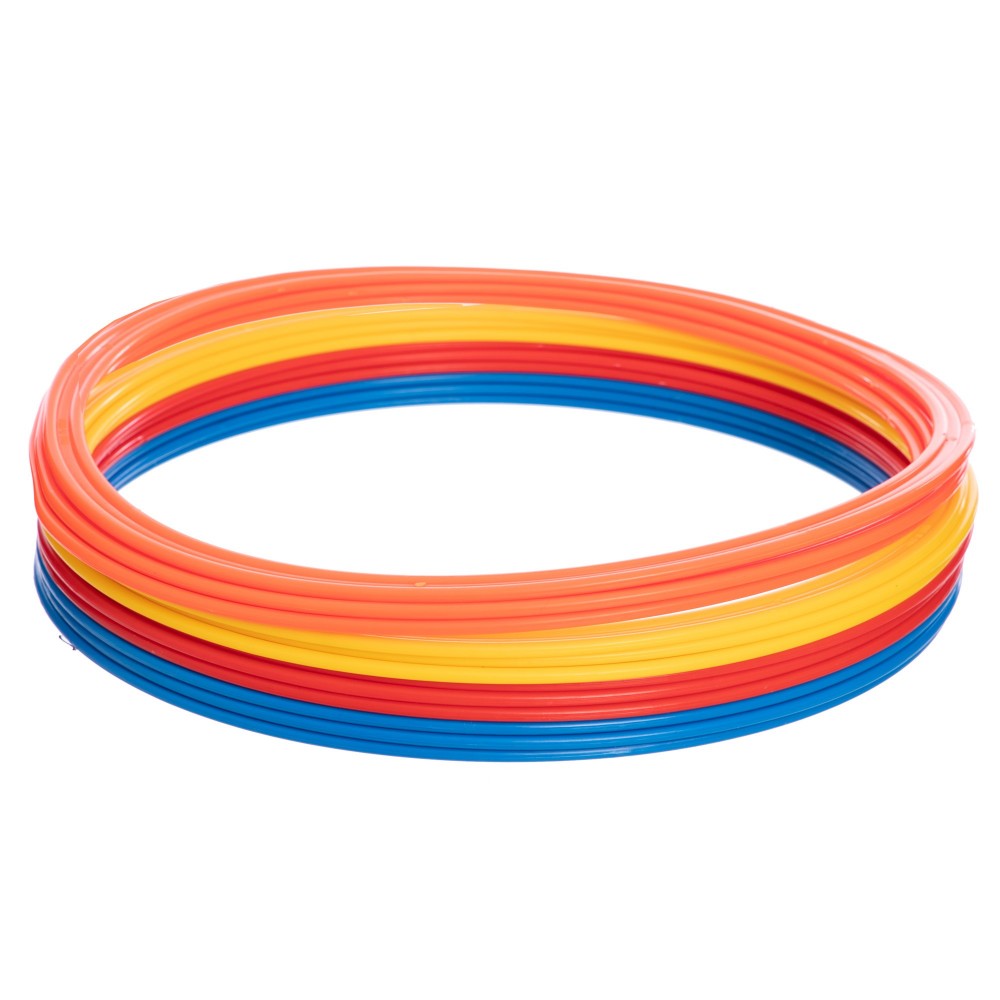 Тренировочные кольца из пластика относятся к наиболее востребованным разновидностям спортивного инвентаря. Они позволяют развивать различные группы мышц, увеличивать выносливость и ловкость. Занятия с тренировочными обручами развивают координацию движений, скорости и силу ног. В комплект входят 12 колец диаметром 40 см, выполненные в четырех цветах - желтом, красном, оранжевом и синем. Для удобства хранения и перевозки инвентаря в комплекте предусмотрен специальный чехол.