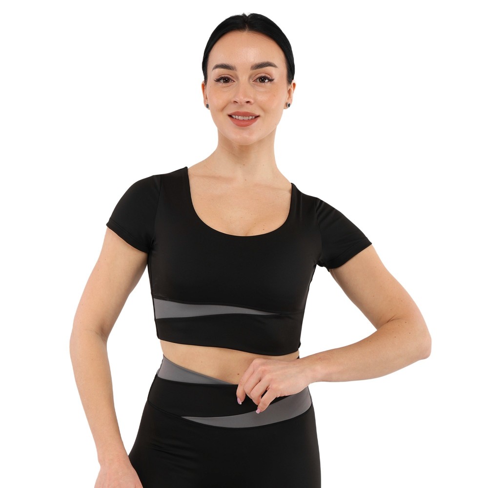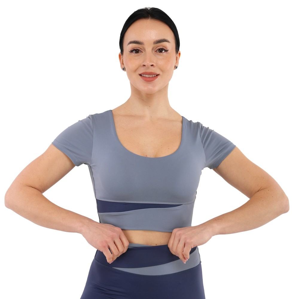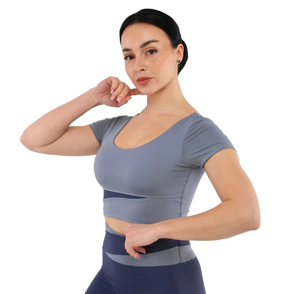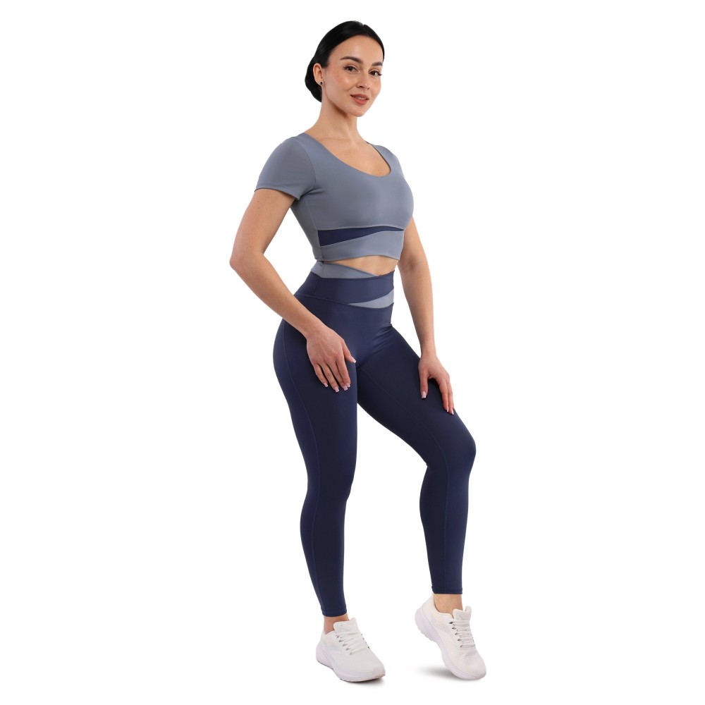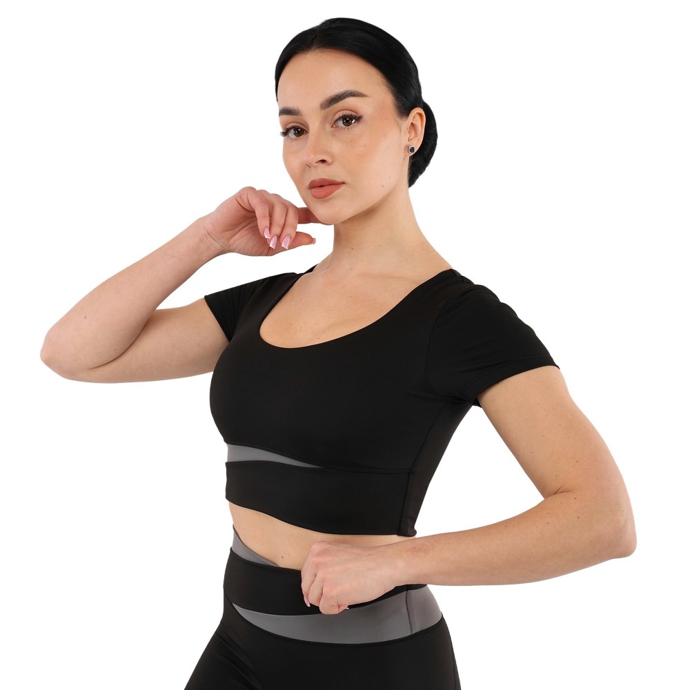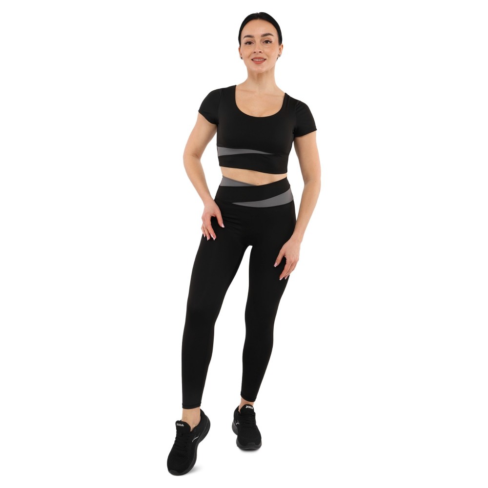 Спортивный костюм предназначен для женщин и представлен в нескольких размерах, которые отлично подходят для взрослых. Кроп-топ выполнен в виде футболки с короткими рукавами и имеет широкий вырез горловины, обеспечивая свободу движений и комфорт. Такой костюм позволит комфортно чувствовать себя во время занятий в тренажерном зале, в студии йоги или фитнеса.