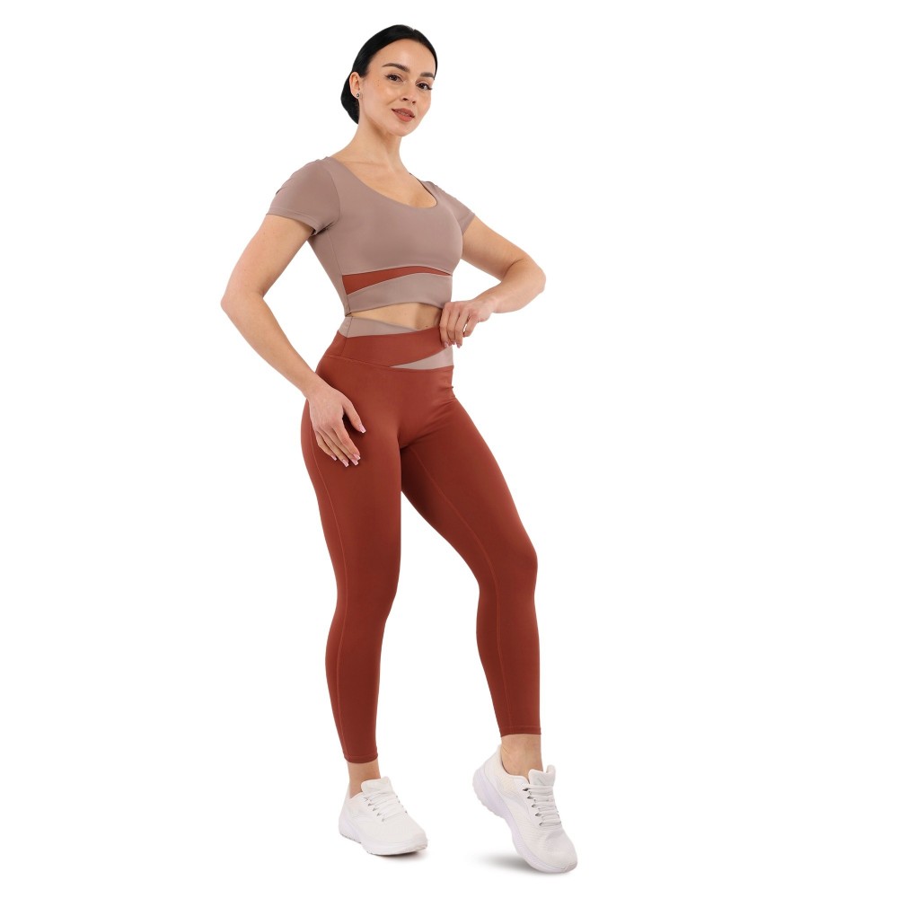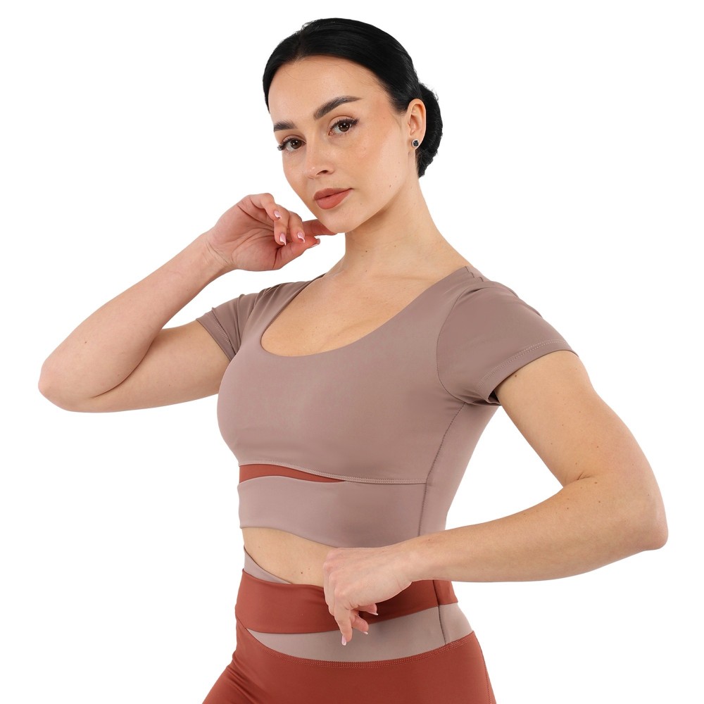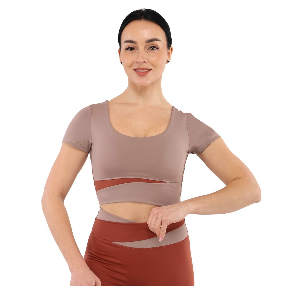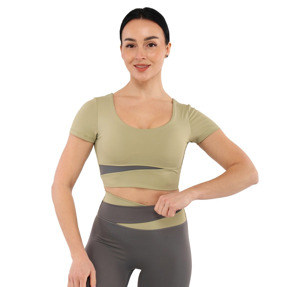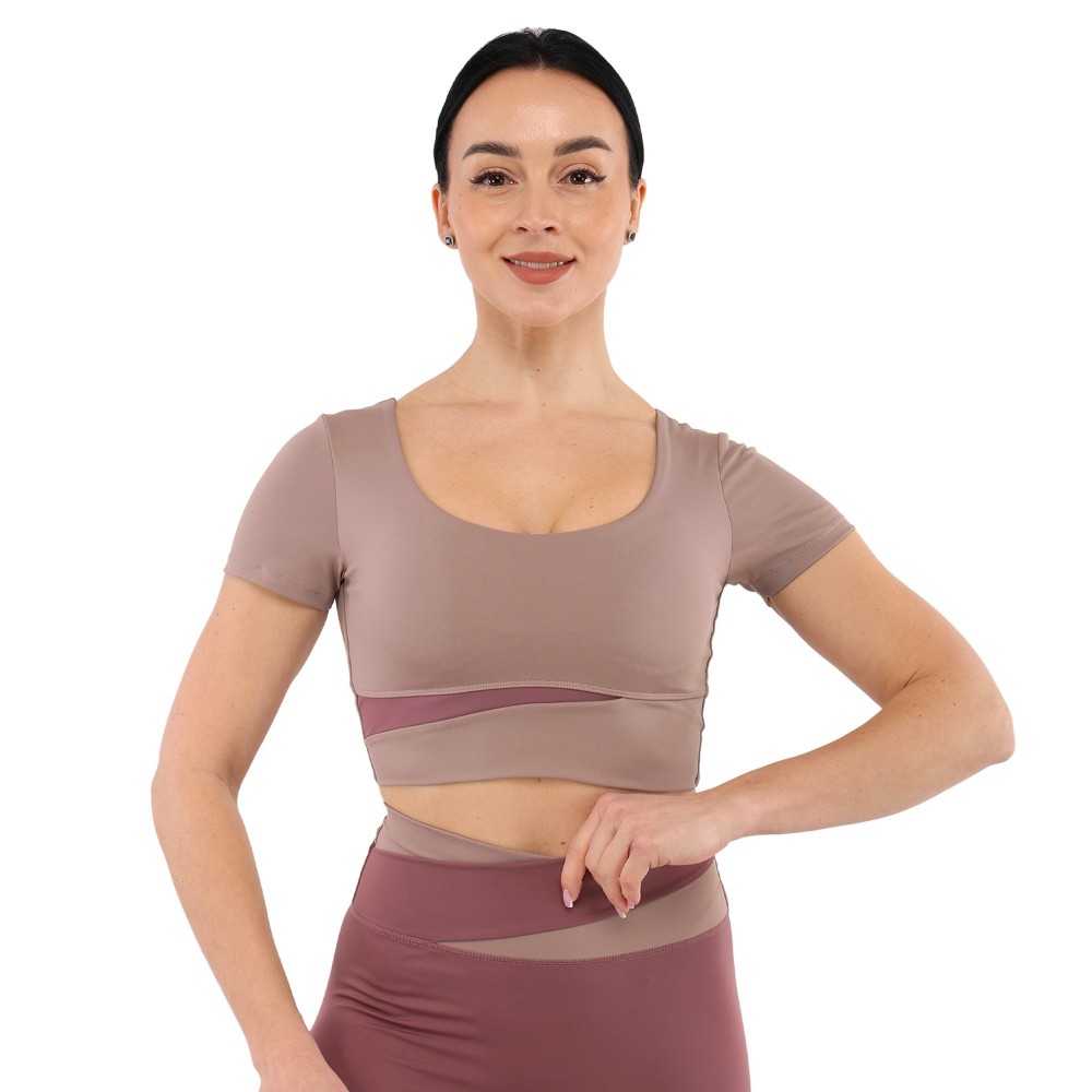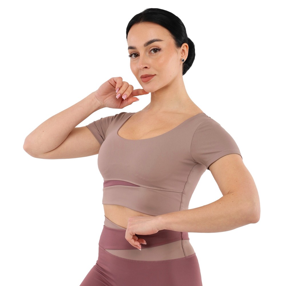 Спортивный костюм предназначен для женщин и представлен в нескольких размерах, которые отлично подходят для взрослых. Кроп-топ выполнен в виде футболки с короткими рукавами и имеет широкий вырез горловины, обеспечивая свободу движений и комфорт. Такой костюм позволит комфортно чувствовать себя во время занятий в тренажерном зале, в студии йоги или фитнеса.