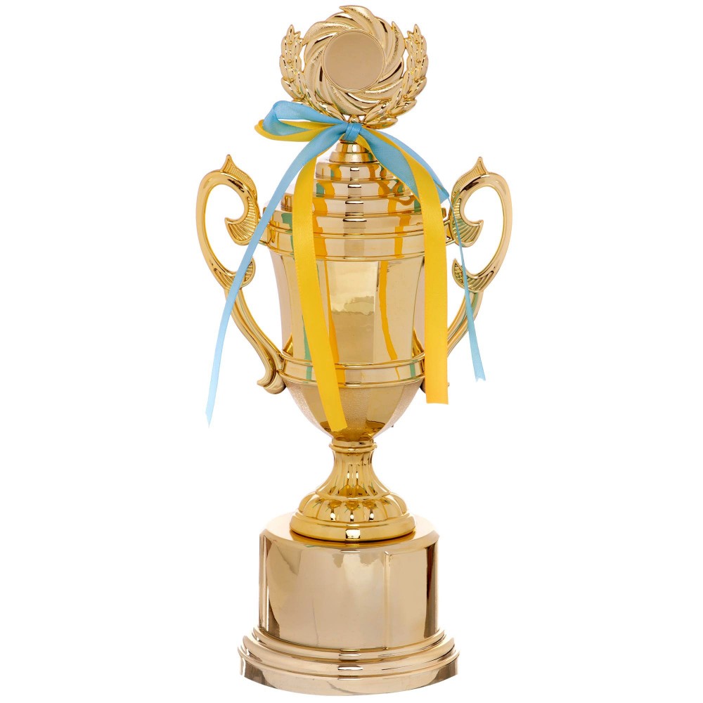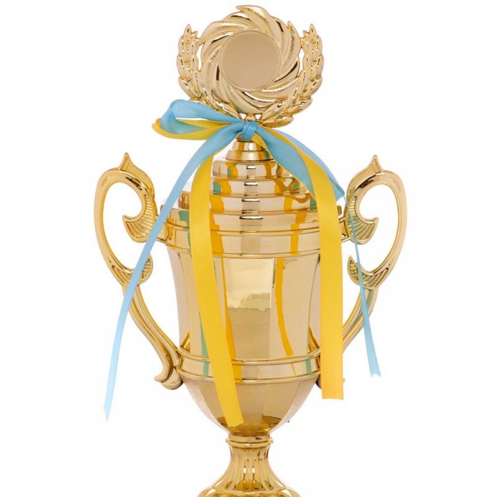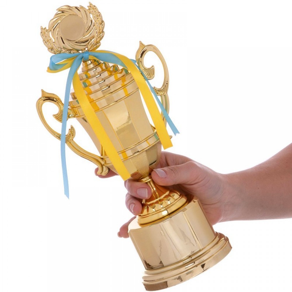 Кубок с ручками окрашен краской золотого цвета. Он изготовлен из пластика. Такая награда станет отличным украшением спортивного кабинета, она дополнит коллекцию медалей.