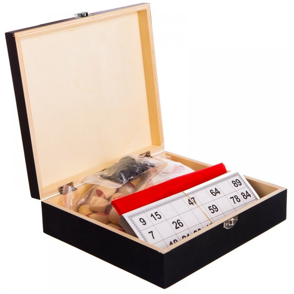 Ищите интересный подарок для взрослого или ребенка? Небольшой набор для игры в лото упакован в привлекательный деревянный кейс. Игра имеет стандартный комплект, который включает 90 бочонков, 24 карты с номерами и пластиковые фишки. Также в наборе вы найдете тканевый мешочек, в котором можно хранить бочонки. Они не растеряются со временем и игроки смогут доставать их из мешочка в процессе игры.