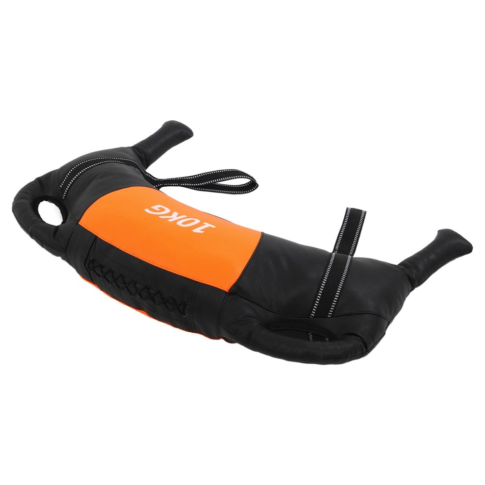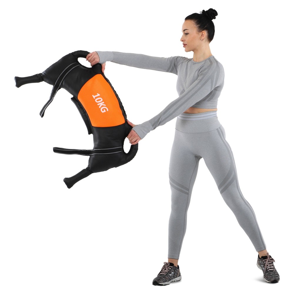 Форма болгарского мешка позволяет захватывать его в четырех местах в зависимости от упражнения, которое вы выполняете. В качестве материала чехла производитель использовал поливинилхлорид, который не боится влаги, а также легко моется. Чехол наполнен металлическими шариками, которые придают мешку веса.