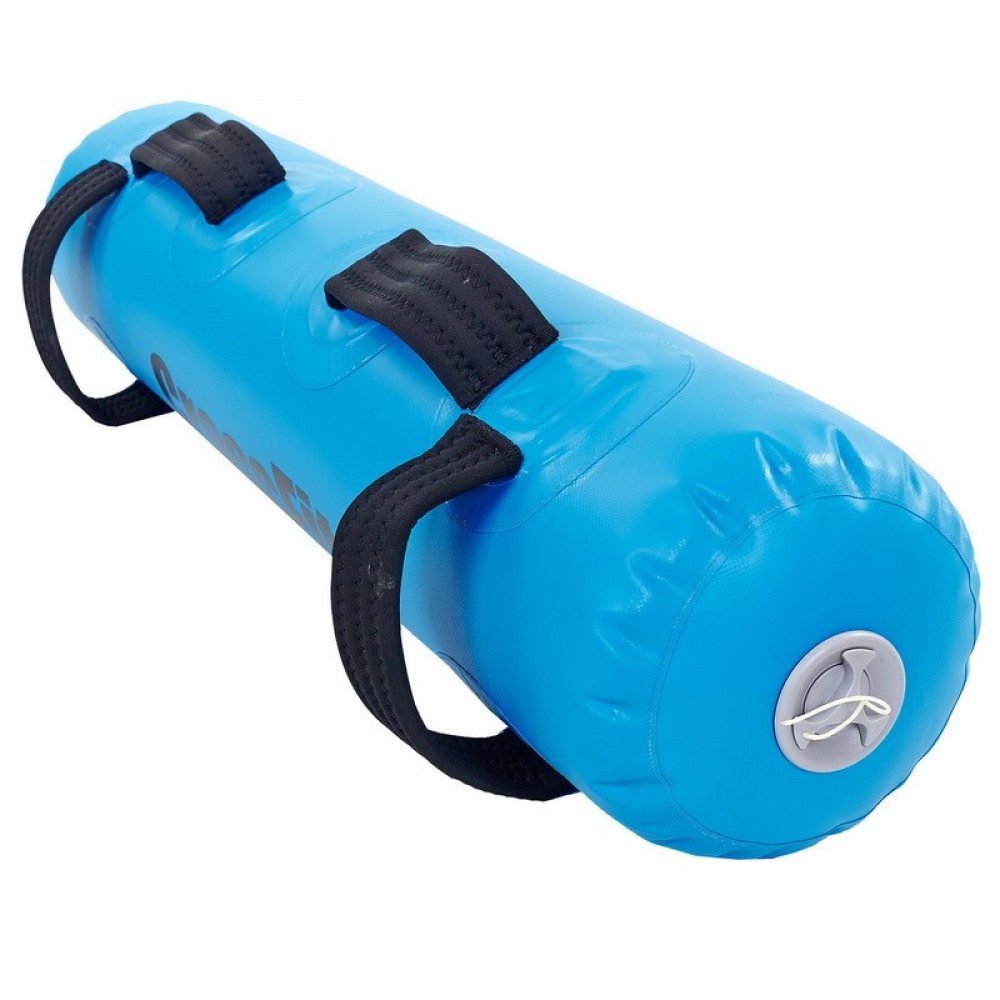 AQUA POWER BAG представляет собой мешок правильной цилиндрической формы, изготовленный из высокопрочного водонепроницаемого поливинилхлорида, устойчивого к износу и механическим деформациям. По сути, это герметичная ёмкость, в которую через специальный клапан можно быстро залить воду или закачать воздух. Эта опция позволяет использовать динамичный мешок практически в любом месте. На поверхности снаряда закреплены удобные поперечные и продольные рукояти, выполненные в виде плотных ременных лямок, которые позволяют использовать разнообразные хваты, что делает список доступных упражнений чрезвычайно широким.
