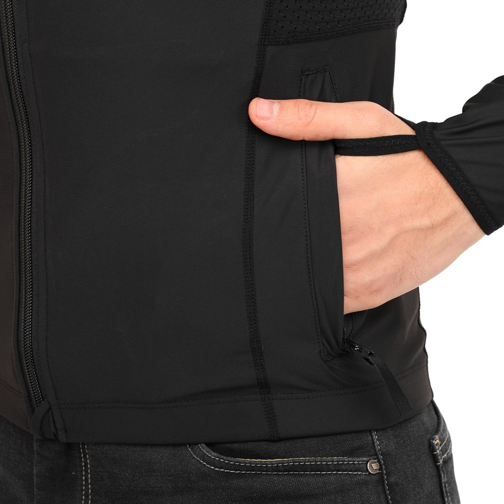 Куртка застегивается на молнию YKK, которая не заедает и служит очень долго. На воротнике добавлена защита от молнии, чтобы предотвратить дискомфорт от трения с телом во время движения. На манжетах расположены упругие петли для больших пальцев — рукава не будут сдвигаться даже при резких динамических движениях.