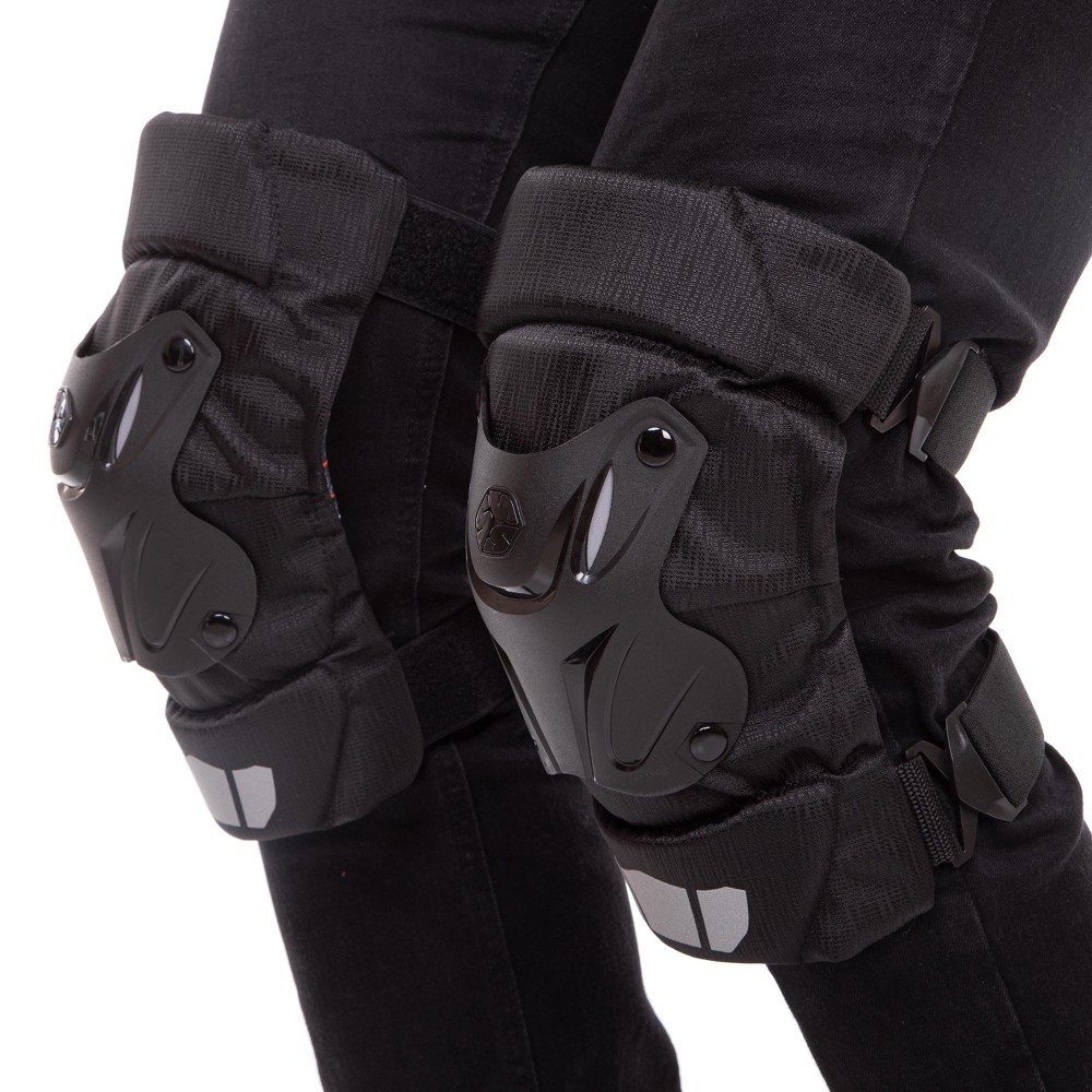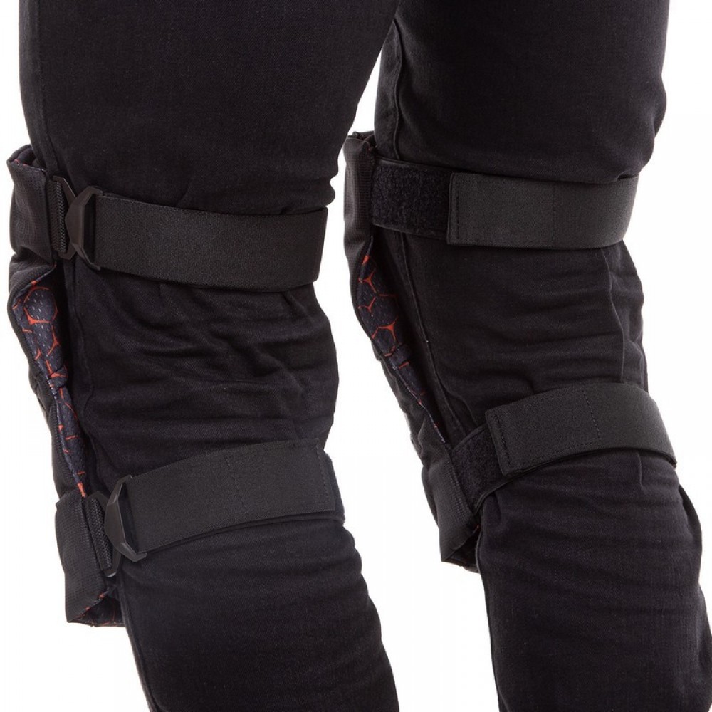 Верх наколенников — прочный пластик. Форма защитной накладки продумана таким образом, чтобы он не мешал водить мотоцикл и давал полную свободу движений. Но при это наколенник защищает колено и области под ним и над ним.