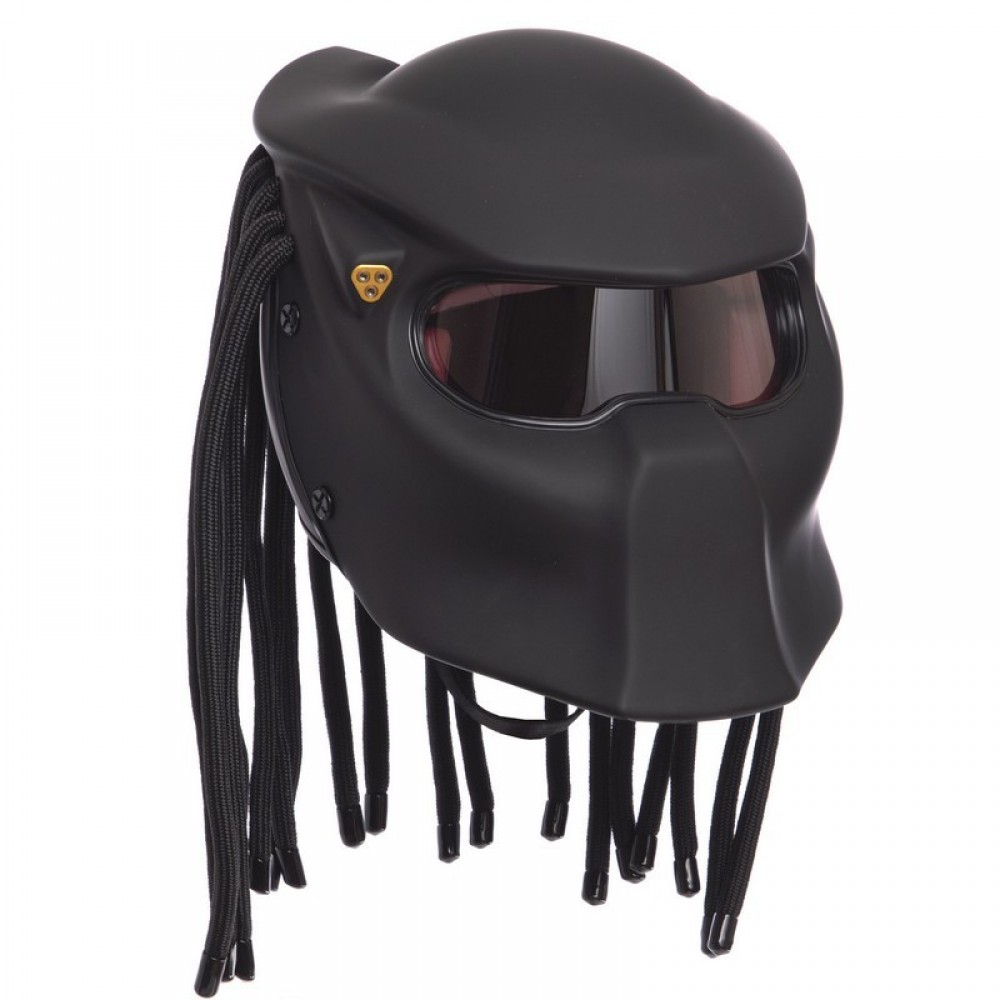 Мотошлем хищник имеет стильный дизайн и защищает голову от травм в случае падения. Экипировка изготовлена из прочного стеклопластика.