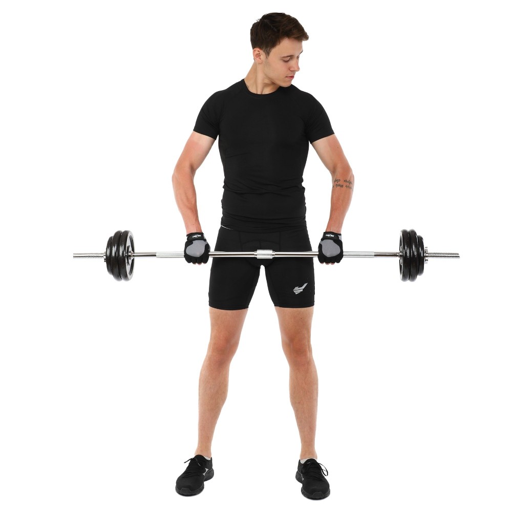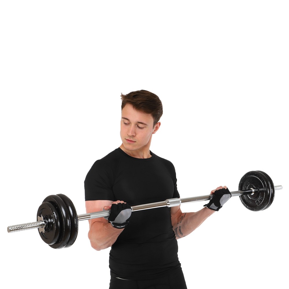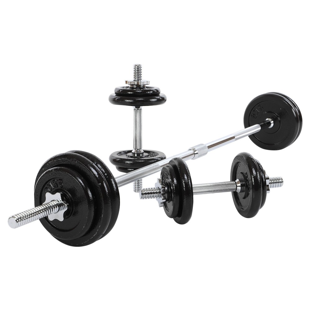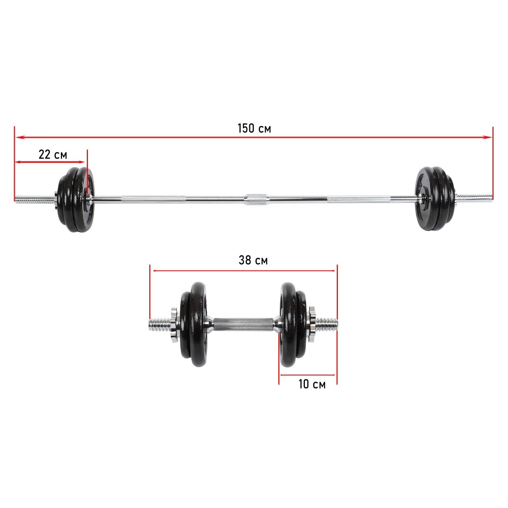 Комплектация набора: блины: 1,5 кг - 4 шт, 2 кг - 4 шт, 2,5 кг - 8 шт, гриф - 3 шт, соединительная муфта - 1 шт, рукоятки многофункциональные - 2 шт, напульсники - 2 шт, перчатки - 1 пара, замки - 4 шт