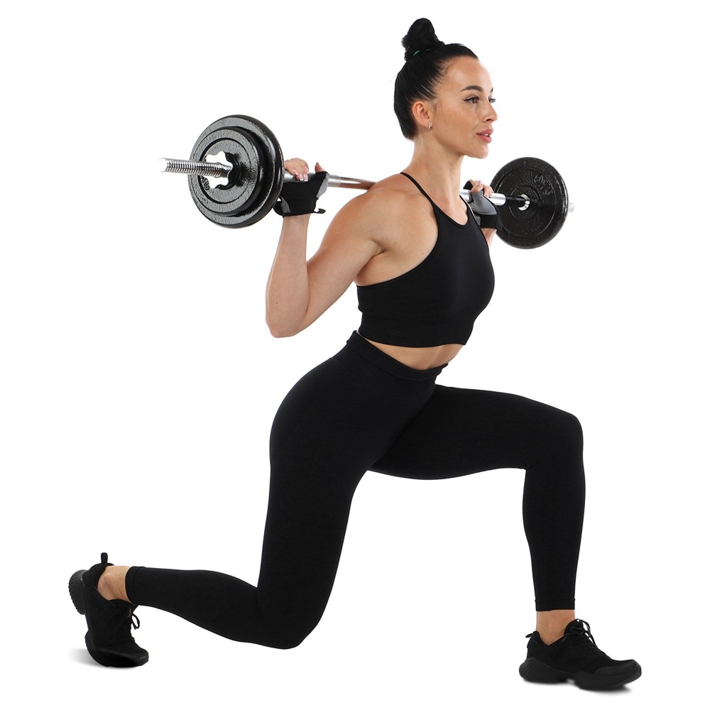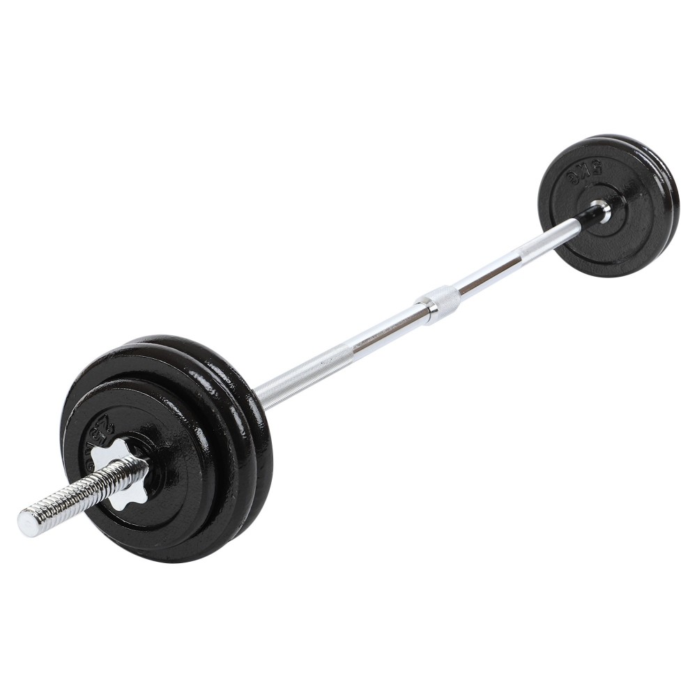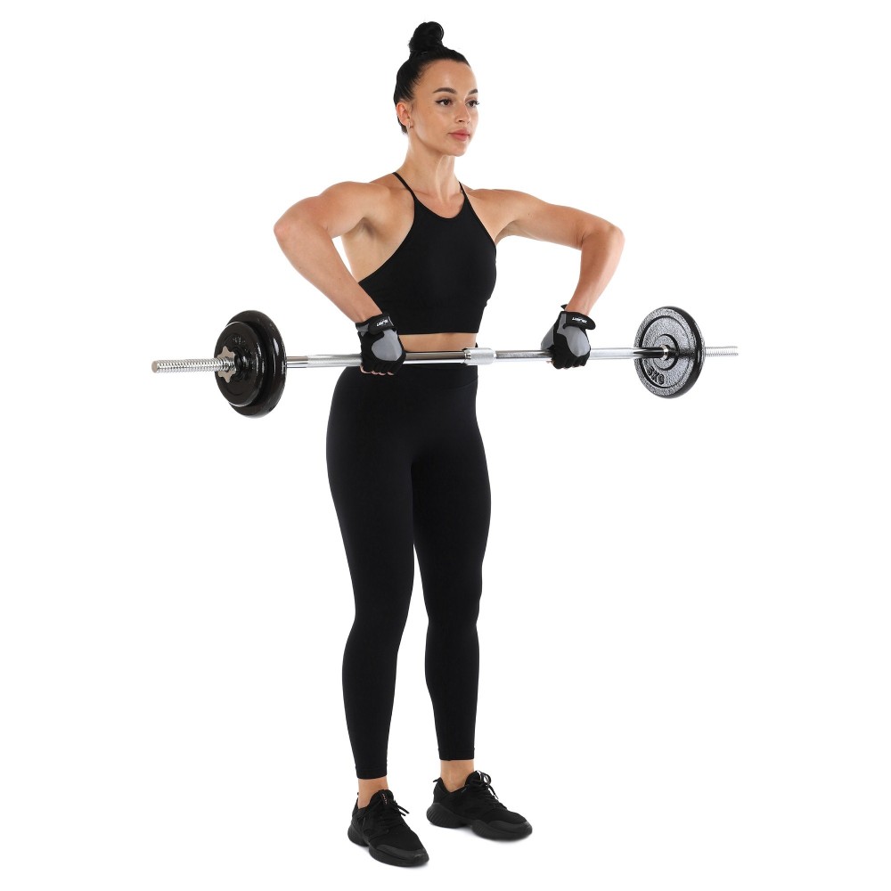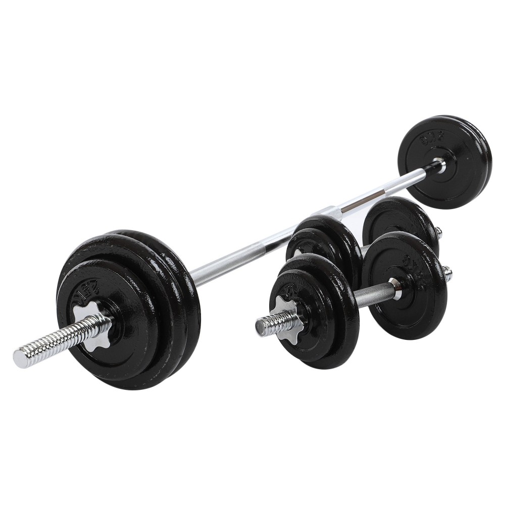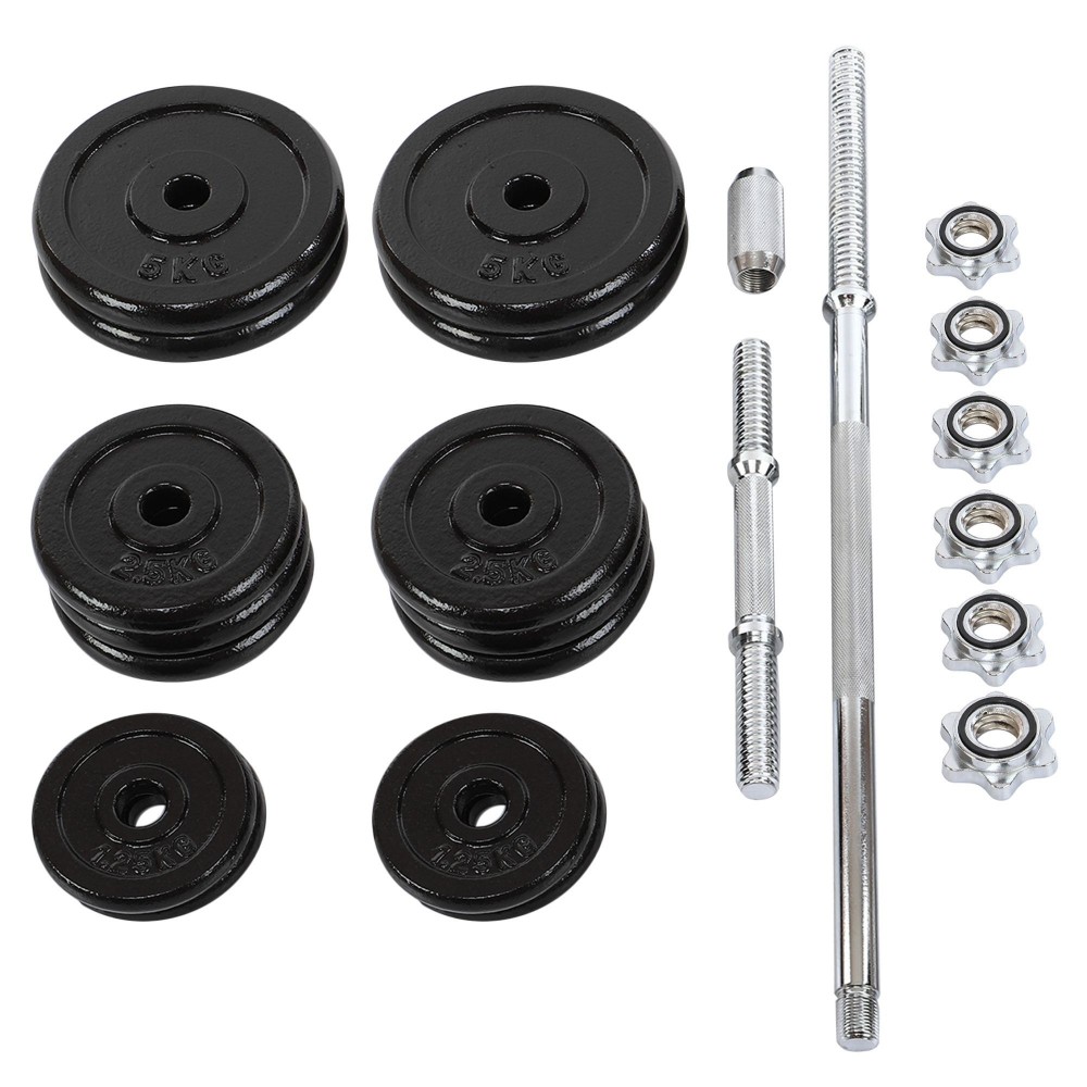 Комплектация набора: блины: 1,5 кг - 4 шт, 2 кг - 4 шт, 2,5 кг - 8 шт, гриф - 3 шт, соединительная муфта - 1 шт, рукоятки многофункциональные - 2 шт, напульсники - 2 шт, перчатки - 1 пара, замки - 4 шт