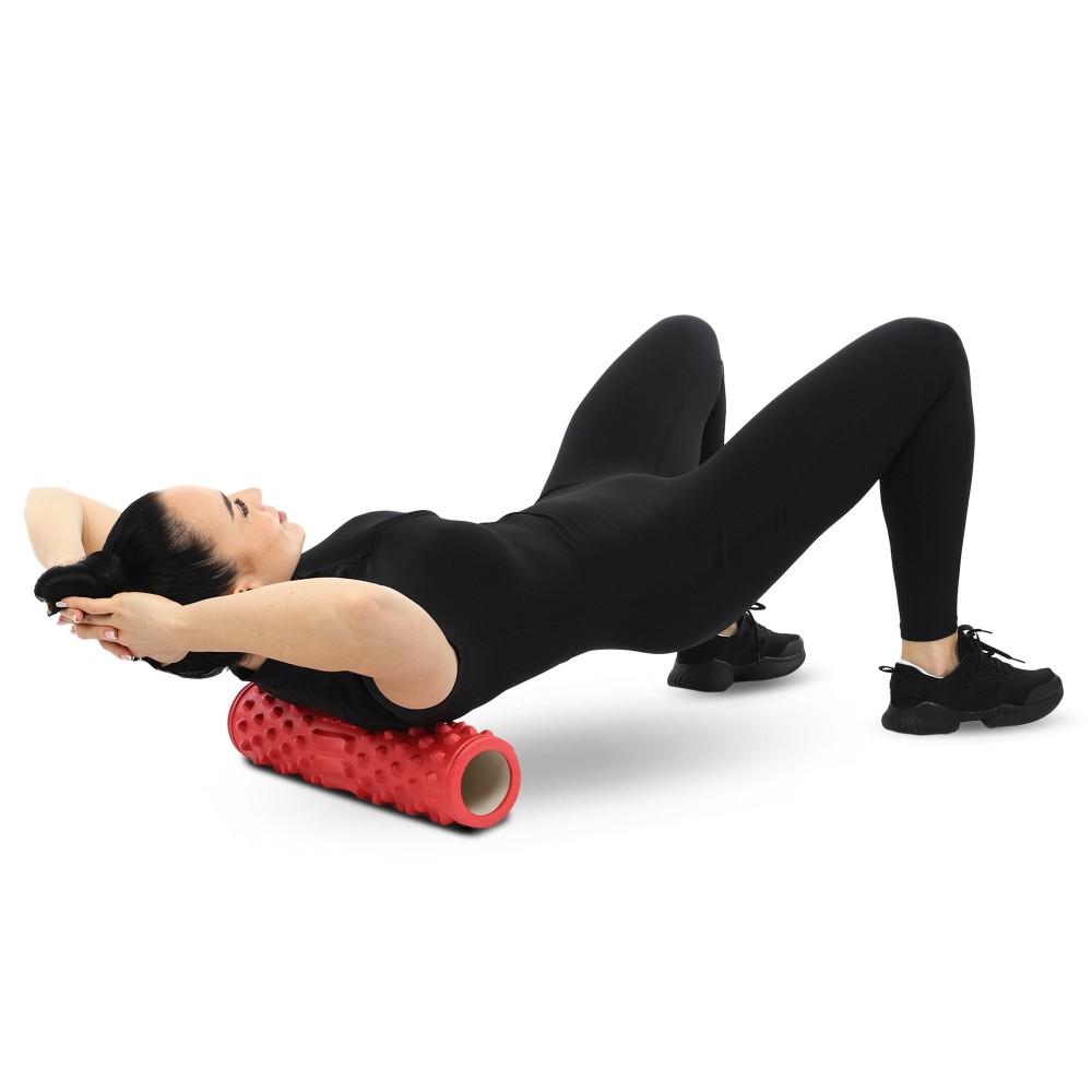 Цилиндрический роллер из мягких материалов высокого качества является эффективным и долговечным средством для самомассажа. Наружная сторона роллера выполнена из материала оптимальной твердости с массажными выступами. Они имеют достаточную высоту для глубокой проработки мышц. В средней части ролик сужается для того, чтобы обезопасить позвоночник спортсмена и направить эффект массажа только на те участки, которые в нем нуждаются. Длинна ролика позволяет работать с разными группами мышц, выполнить массаж рук, ног и спины.