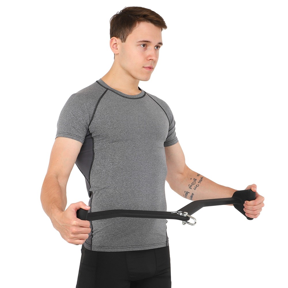 Особое внимание в конструкции уделено удобству хвата. Поверхность рукоятки покрыта поливинилхлоридом (PVC) — этот материал предотвращает скольжение рук во время выполнения упражнения, обеспечивая надежный контроль даже при интенсивной тренировке. Аксессуар легко фиксируется на любом блочном тренажере благодаря универсальной проушине под карабин.