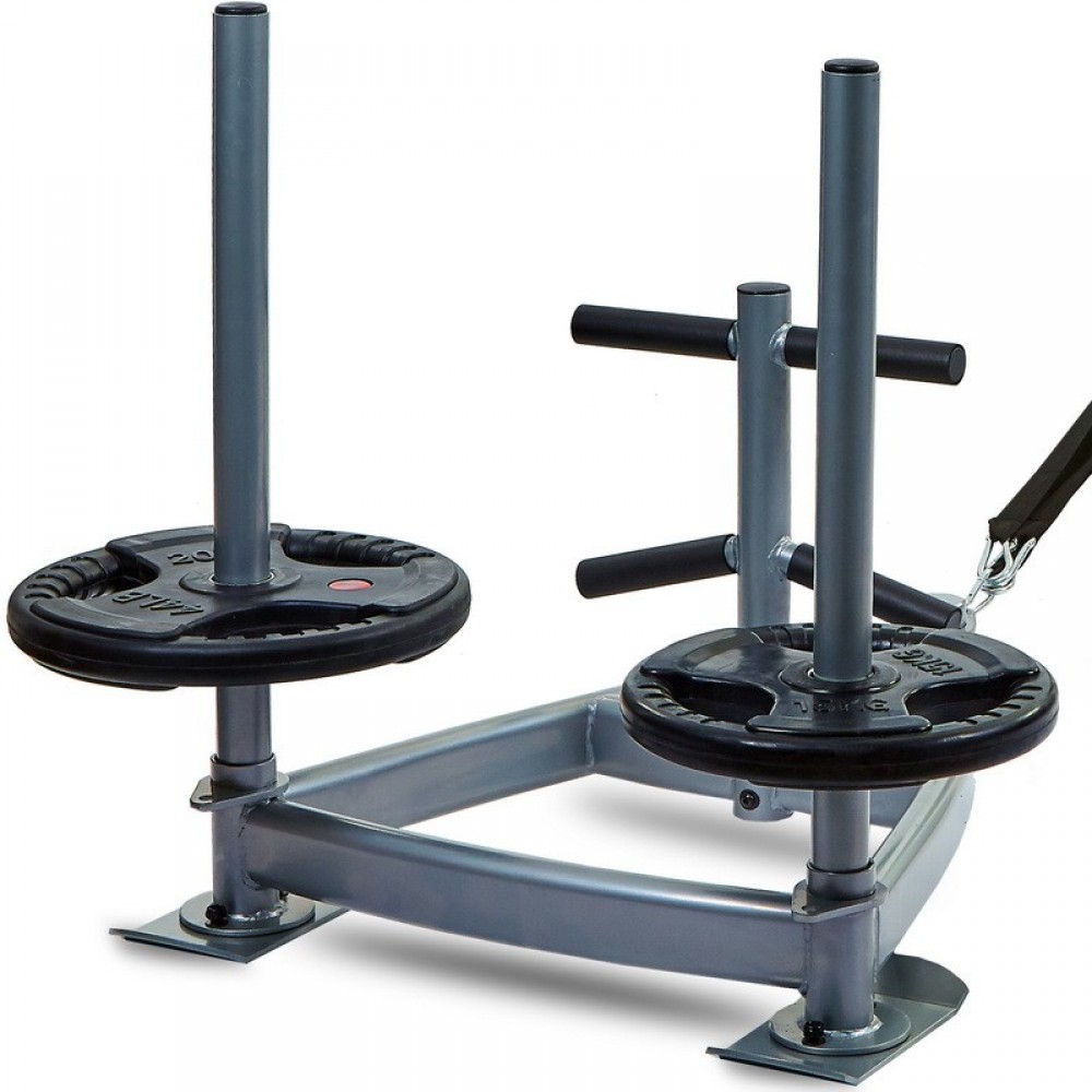 Сани для кроссфита представляют собой рамную конструкцию из металла промышленного класса, установленную на три загнутые с двух сторон лыжи. В качестве нагрузки служат блины от стандартной или олимпийской штанги, которые надеваются на съёмные весовые стеки. Чтобы манипулировать санями (тянуть или толкать), предусмотрена система рукоятей, позволяющая использовать различные хваты – прямой, обратный, нейтральный. Также в комплекте идут специальные тяговые петли из полиэстера, с упряжью, состоящей из наплечных лямок, которые крепятся к саням с помощью стальных карабинов.