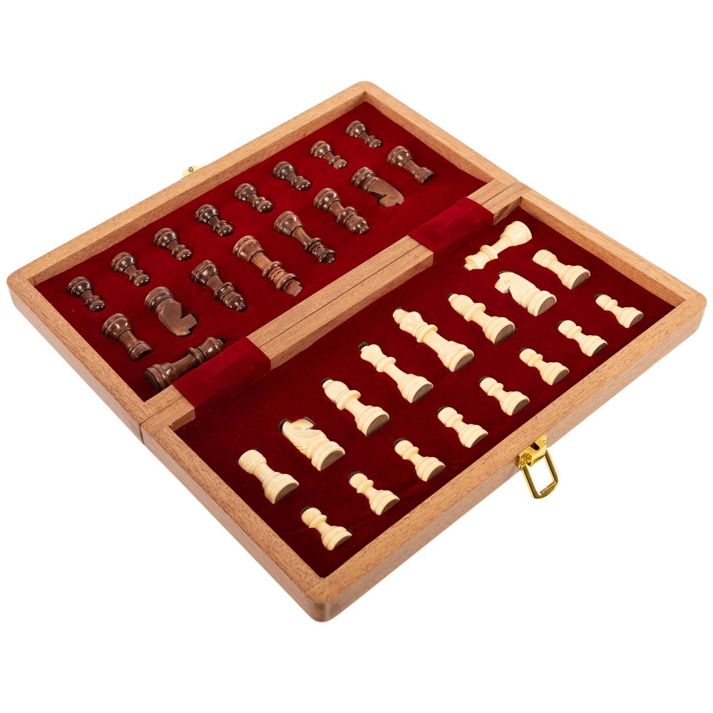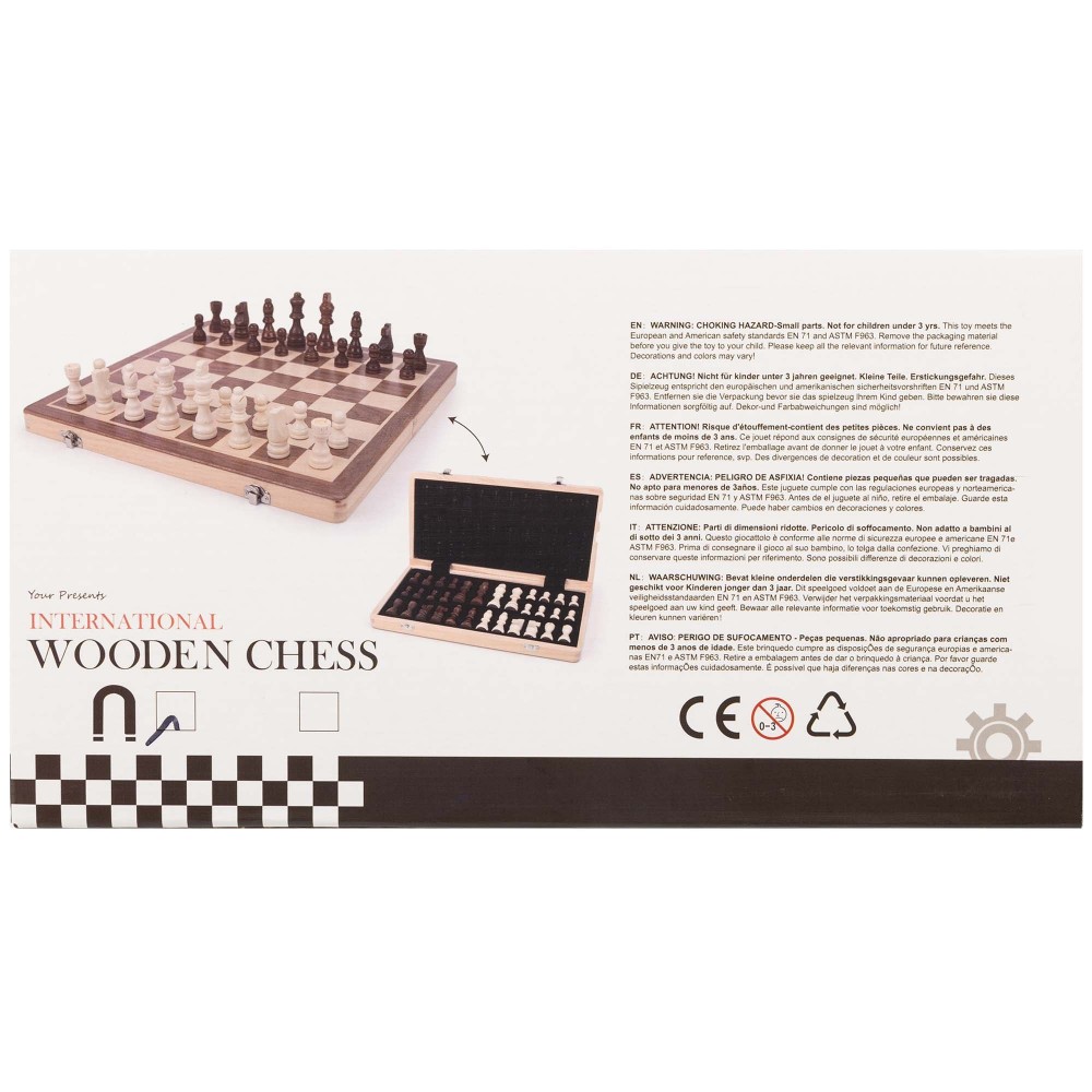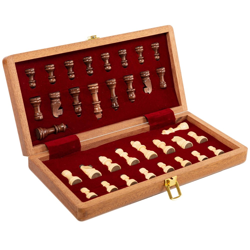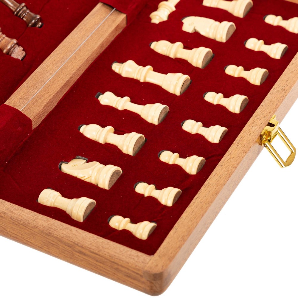 Классический шахматный набор изготовлен из натурального дерева. Доска имеет размер в разложенном виде 29 х 29 х 2.5 см. Также из натурального дерева выполнены фигуры и фишки. Петли и замки изготовлены из прочного металла, что гарантирует долговечность набора. Доска одновременно является футляром для удобного хранения всех фигур. Там они аккуратно раскладываются каждая на свое место. В сложенном виде доска имеет компактные размеры, всего 29 x 14.5 x 5 см, что позволяет удобно брать ее с собой для игры вне дома. Набор упакован в яркую картонную коробку.
