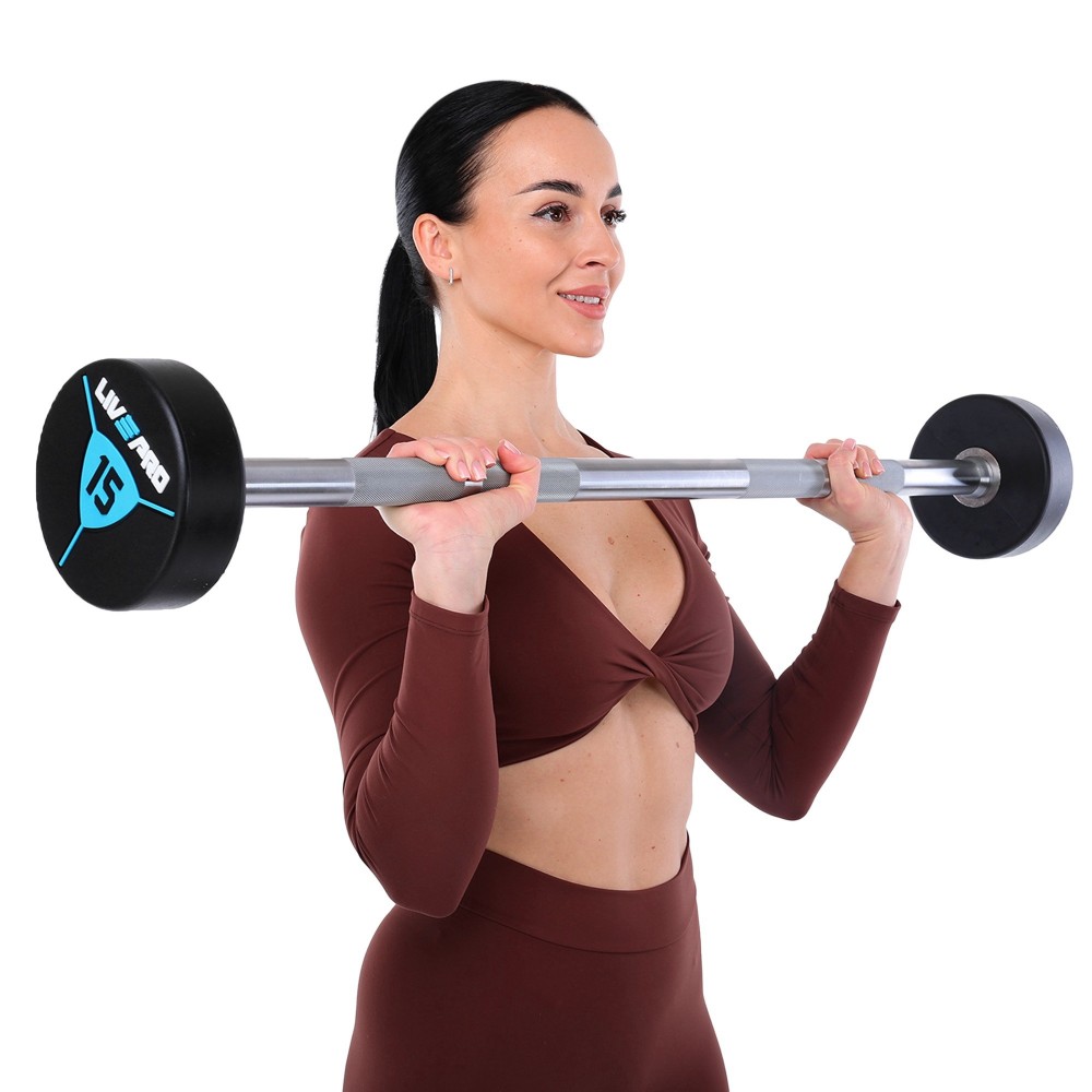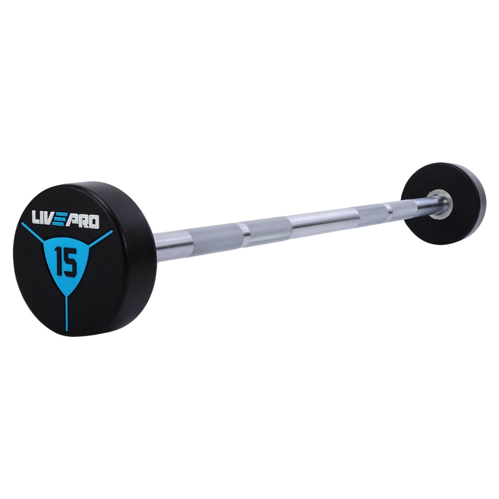 Штанга неразборная с фиксированным весом прямая полиуретановая LiveUp LP8010-15 длина-89,2см 15кг черный-синий