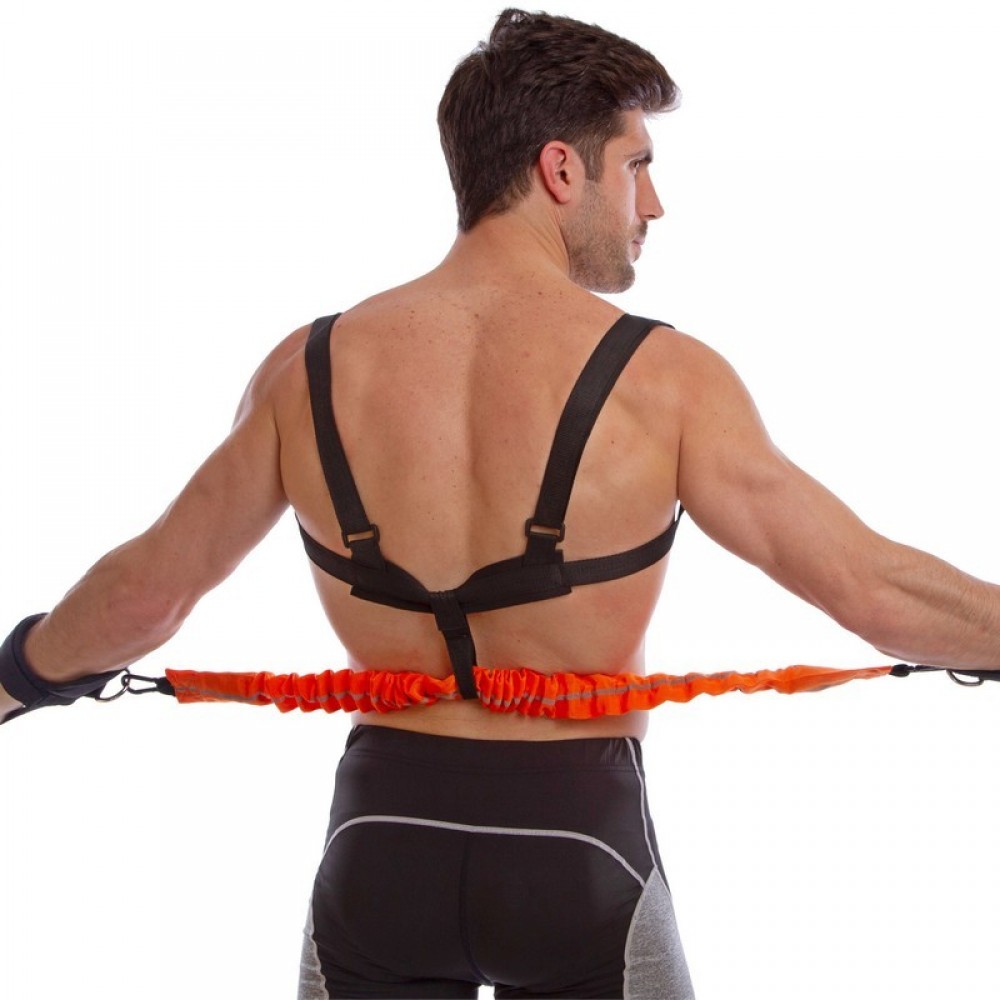 Этот тренажер состоит из эластичного жгута в ярком кожухе, плечевых ремней и деталей крепления. Размер у изделия универсальный – застёжки-липучки позволяют уменьшать и увеличивать его в зависимости от телосложения спортсмена. Манжеты, которые надеваются на запястья, не препятствуют кровотоку. Также они снабжены петлями-фиксаторами. Снаряд надевается на корпус атлета.